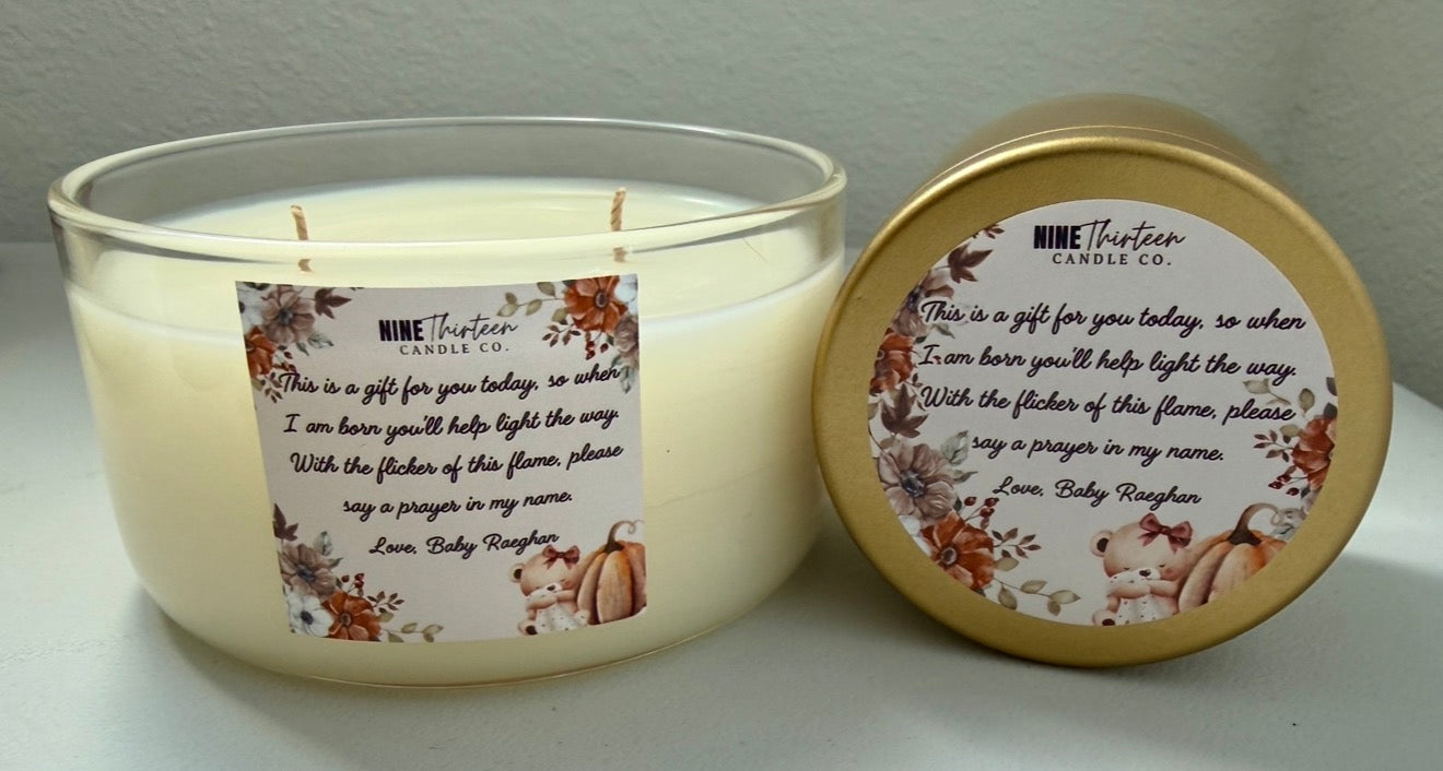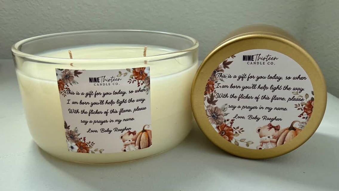 The baby shower package will Include a free 12 oz candle for mama.